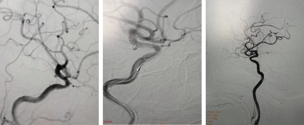 動(dòng)脈瘤位于大腦中動(dòng)脈分叉部,屬血流沖擊部位,雖尚未破裂,但形態(tài)不規(guī)整,瘤體有分別突向前、后方的小突起,呈分葉狀。提示未來存在破裂風(fēng)險(xiǎn)。與患者溝通病情后,患者出于對(duì)動(dòng)脈瘤破裂出血風(fēng)險(xiǎn)的恐懼,積極要求行手術(shù)治療。